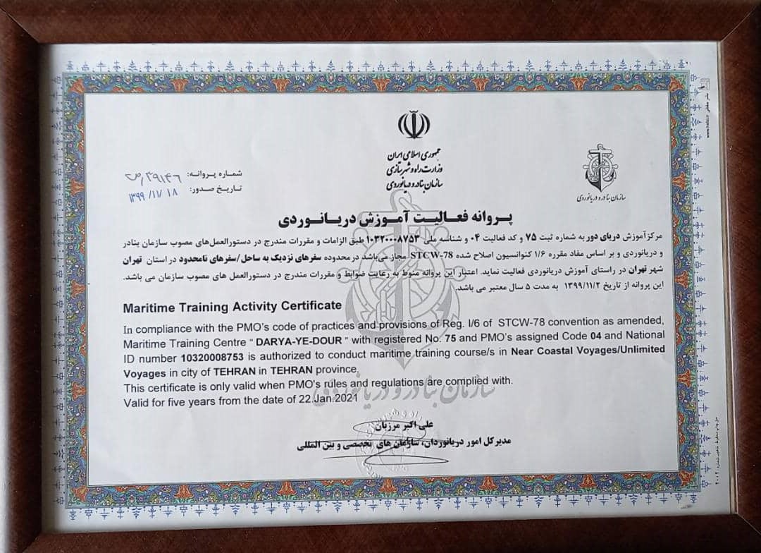 پروانه فعالیت موسسه آموزش دریانوردی” دریای دور “